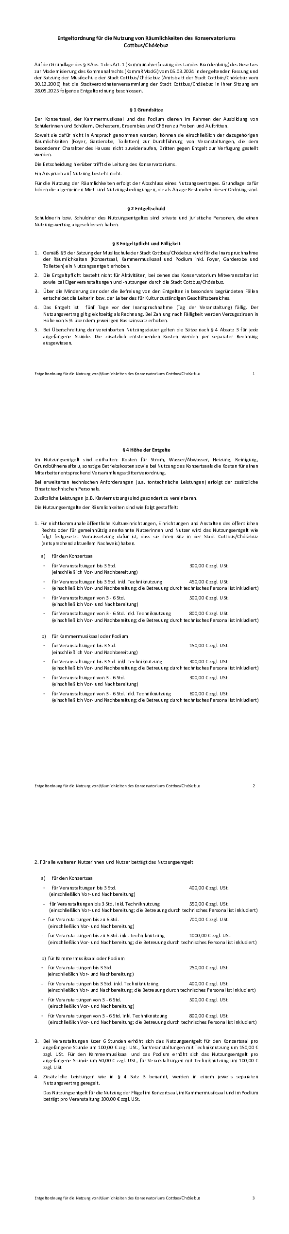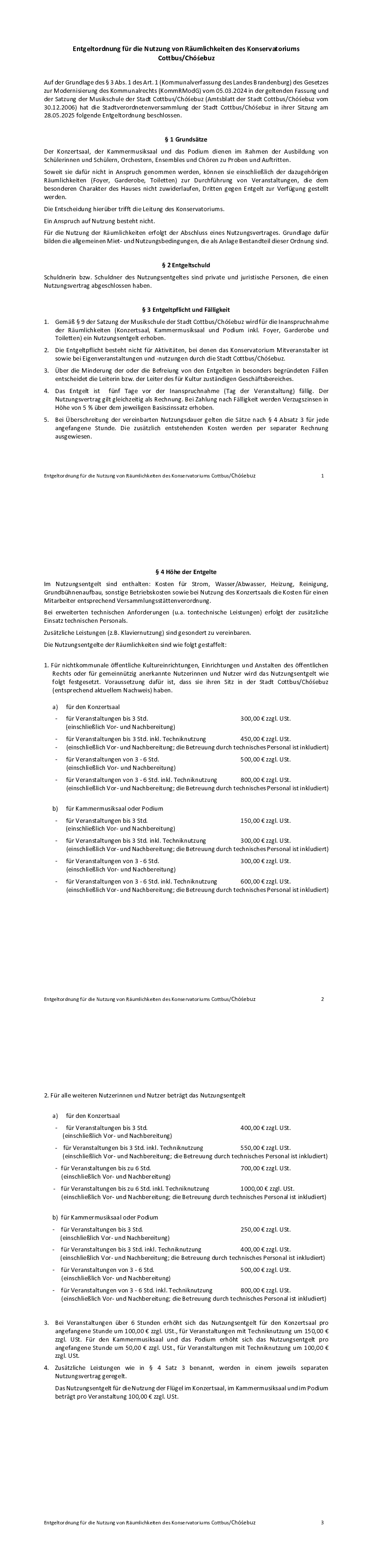 Entgeltordnung Nutzung von Räumlichkeiten des Konservatoriums