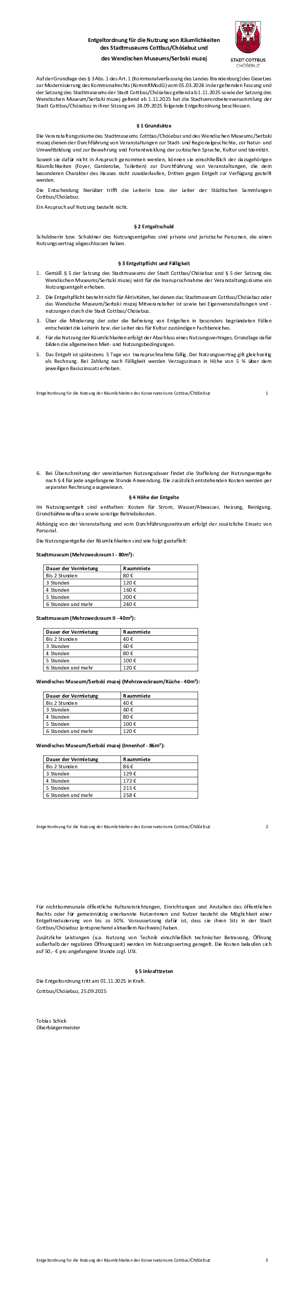 Entgeltordnung für die Nutzung von Räumlichkeiten