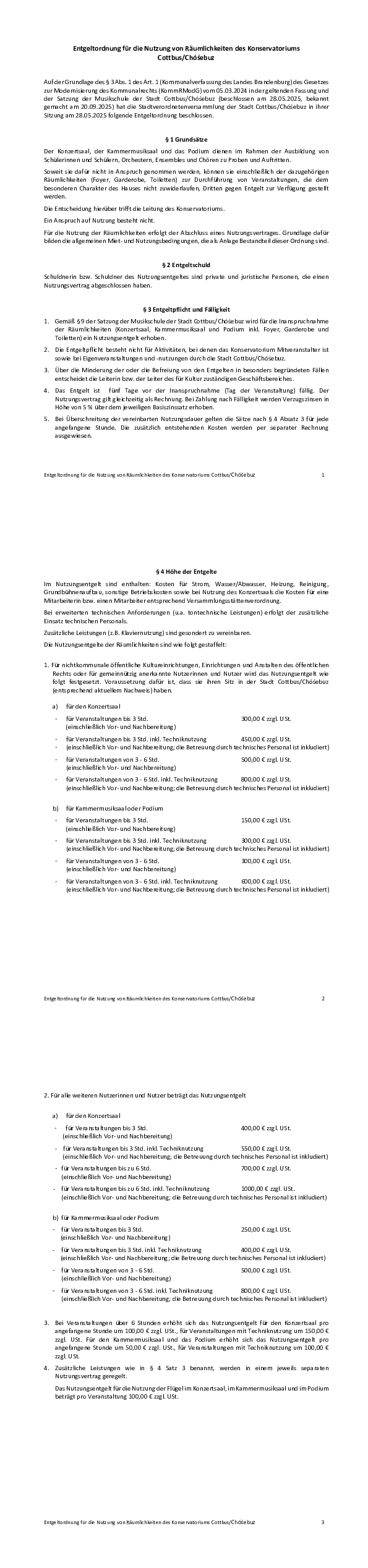 Entgeltordnung für die Nutzung von Räumlichkeiten des Konservatoriums Cottbus-Chóśebuz vom 20.09.2025