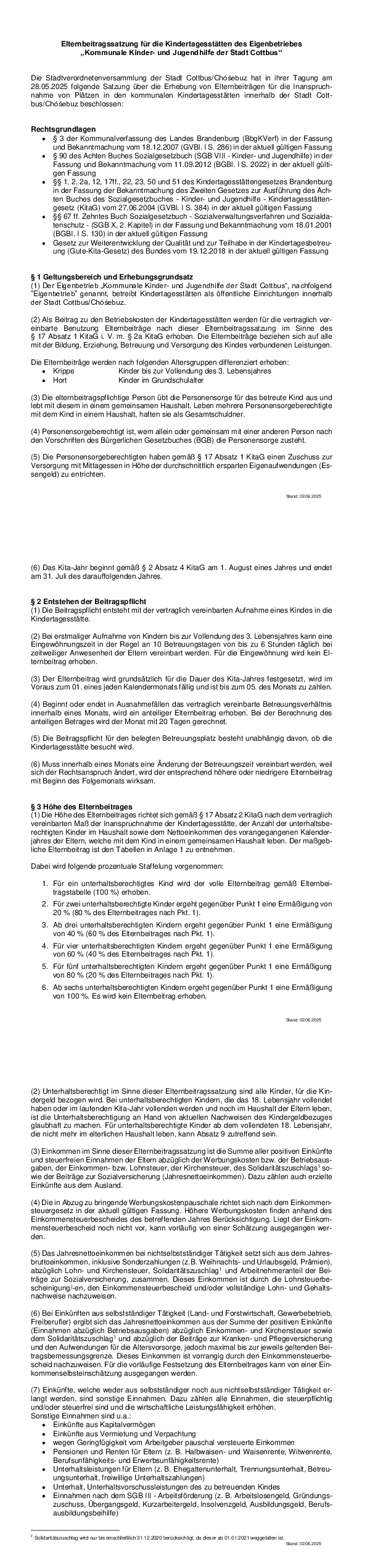 Elternbeitragssatzung für die Kindertagesstätten des Eigenbetriebes „Kommunale Kinder- und Jugendhilfe der Stadt Cottbus“