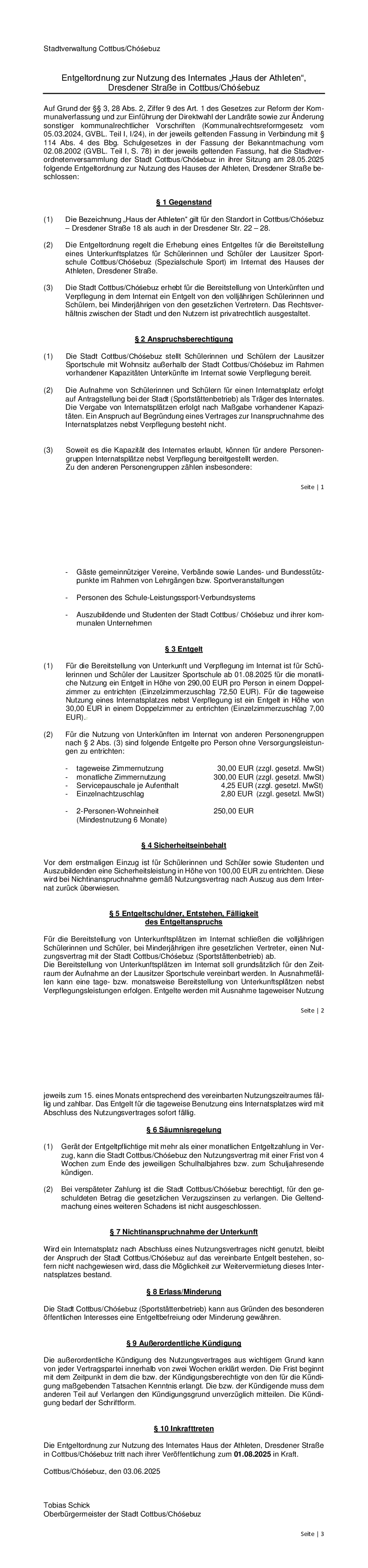 Entgeltordnung zur Nutzung des Internates