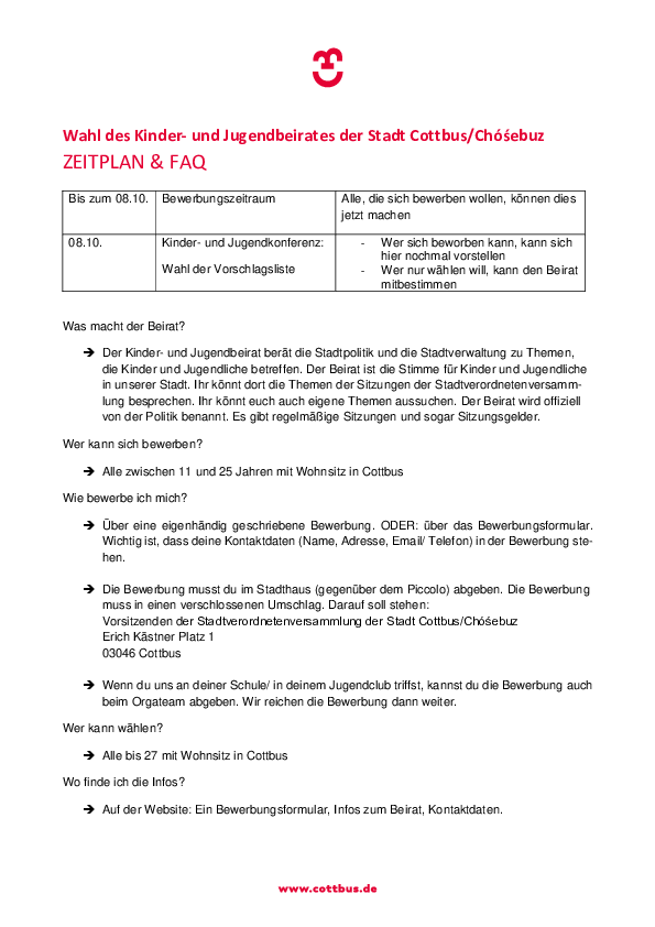 Bei Rückfragen stehen der aktuell gewählte Kinder- und Jugendbeirat (kinder-jugendbeirat@cottbus.de) und die Kinder- und Jugendbeauftragte (lea.sattler@cottbus.de) zur Verfügung.