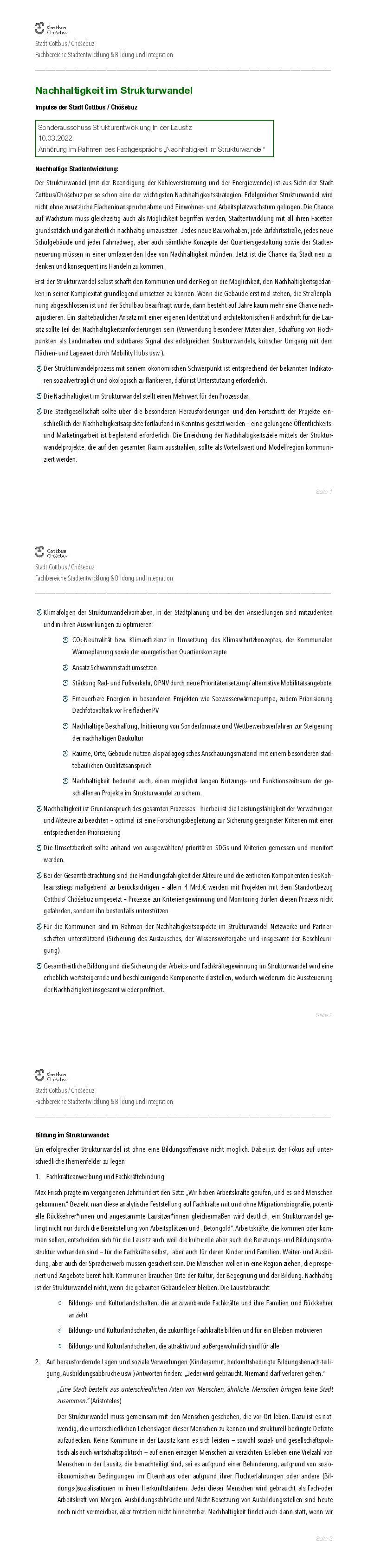 Cottbus/Chóśebuz ist eine Kommune im Aufbruch mit vielen verschiedenen Facetten, besonderen Traditionen und Widersprüchen. Vor dem Hintergrund des Strukturwandels in der Lausitz wie auch der aktuellen weltpolitischen Lage steht Cottbus/Chóśebuz vor neuen gesellschaftlichen Herausforderungen wie die Fachkräftesicherung, Integration von Neuzugewanderten und Digitalisierung. Für die Bürgerschaft ergibt sich daraus die Notwendigkeit, sich veränderten Bedingungen in allen Lebensbereichen zu stellen, neugierig und weltoffen zu sein sowie das persönliche und gesellschaftliche Umfeld mitzugestalten.