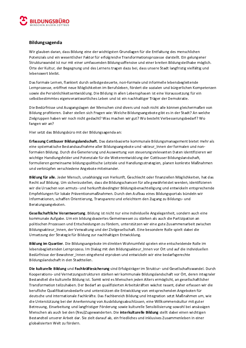 Die Implementierung der Bildungsagenda erfolgt in enger Zusammenarbeit mit den Bildungseinrichtungen und der Stadtgesellschaft. Die Bildungsagenda ist ein dynamisches Dokument, das sich kontinuierlich weiterentwickelt und den aktuellen Herausforderungen in der Bildungslandschaft gerecht wird. Sie bildet die Grundlage für eine nachhaltige und zukunftsorientierte Bildungspolitik in Cottbus.