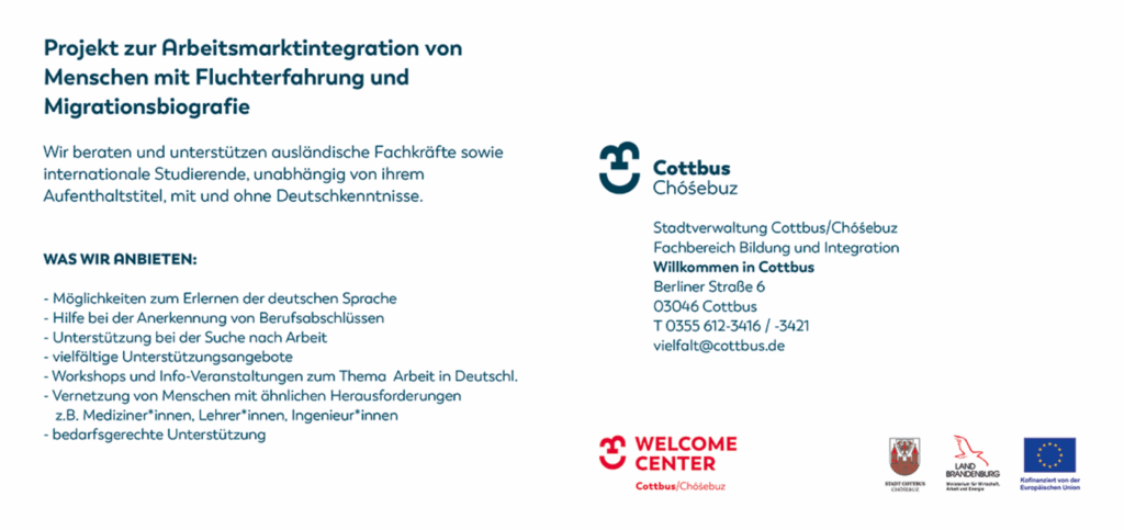 Die Stadt Cottbus/Chóśebuz legt im Projekt „Willkommen in Cottbus“ einen besonderen Fokus auf internationale Fachkräfte und internationale Studierende. Ziel der Förderung ist es, Anlauf- und Beratungsstellen für Menschen mit Migrationsgeschichte aufzubauen und vorzuhalten. Sie sollen die Beschäftigungsfähigkeit von Menschen mit Migrationsgeschichte erhöhen. Diese Stellen sollen dazu beitragen eine Transparenz über die vor Ort existierenden Angebote und konkreten Hilfestellungen zu den Themen Arbeit, Leben, Familie, Schule, Wohnen, Freizeit, Bildung, Gesundheit und Alltag herzustellen. Menschen mit Migrationsgeschichte, darunter Geflüchtete, die bereits im Land Brandenburg leben, sollen bei der Qualifizierung, dem Einstieg in die Ausbildung und in die Arbeit sowie bei allen alltäglichen Fragen bei Bedarf unterstützt werden.