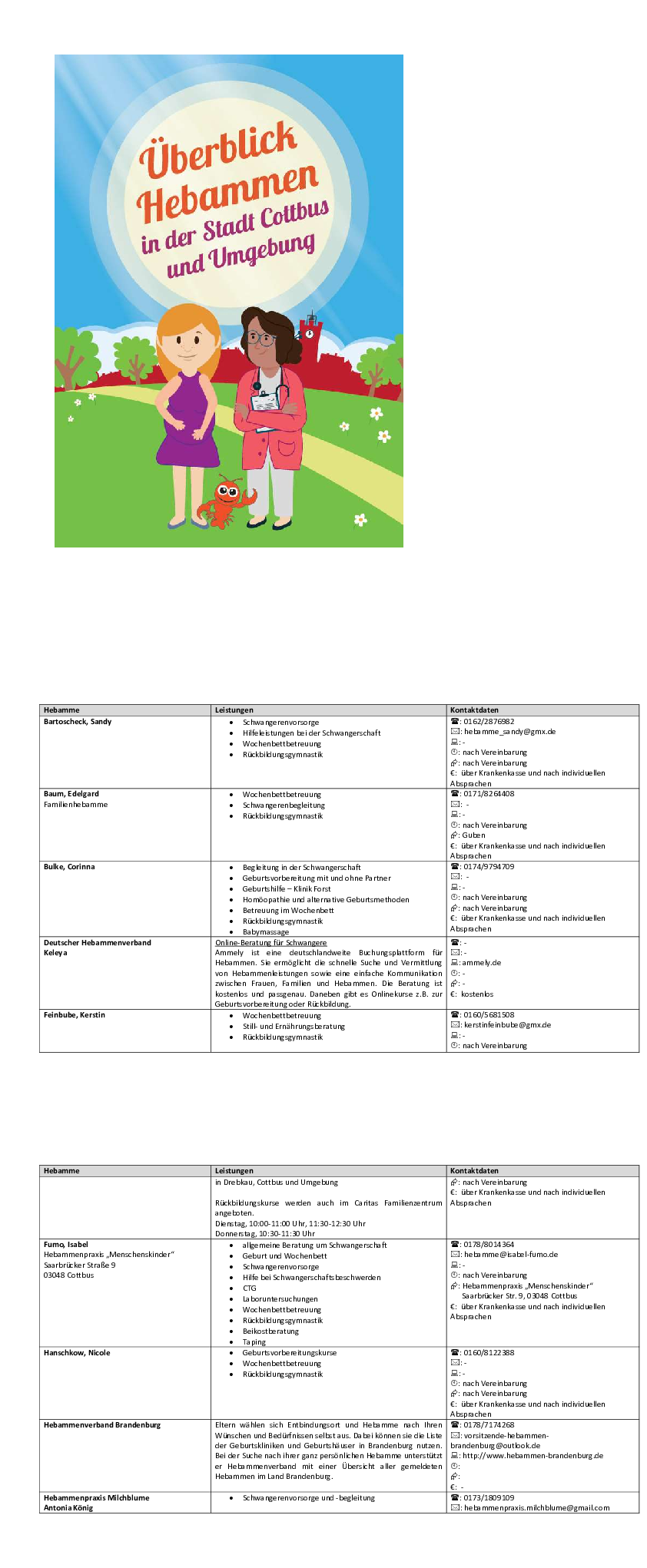Hier steht eine Übersicht von in Cottbus tätigen Hebammen, ihren Leistungen und Kontaktdaten zur Verfügung.