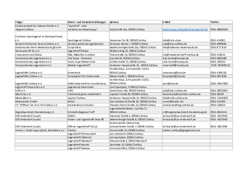 | Humanistisches Jugendwerk e.V. | Mobiler Jugendtreff | Sandower Hauptstraße 11 , 03042 Cottbus | mobi-treff@humaju.de | 0176 790 900 43 |
