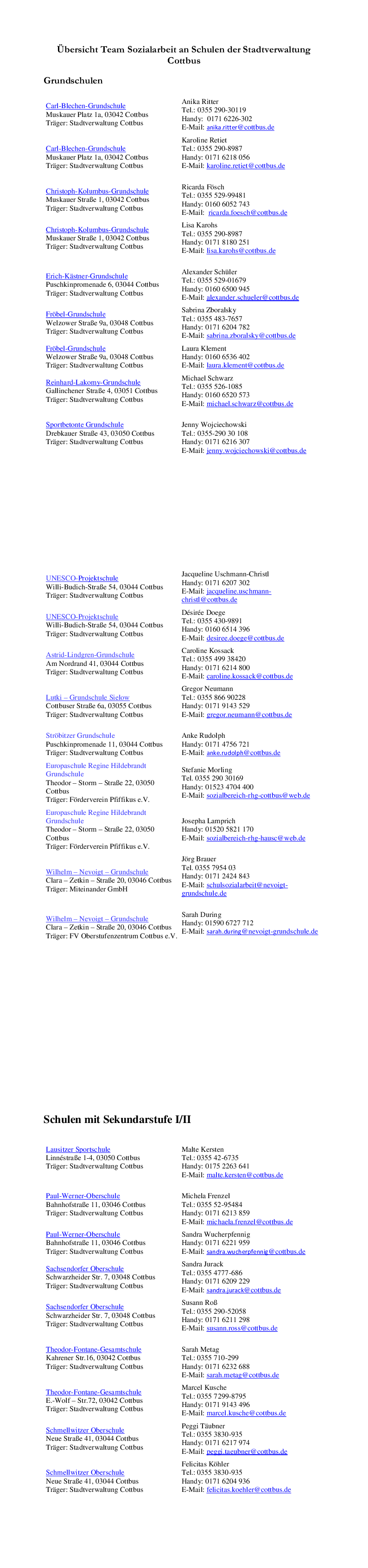 | UNESCO-Projektschule Willi-Budich-Straße 54, 03044 Cottbus Träger: Stadtverwaltung Cottbus |