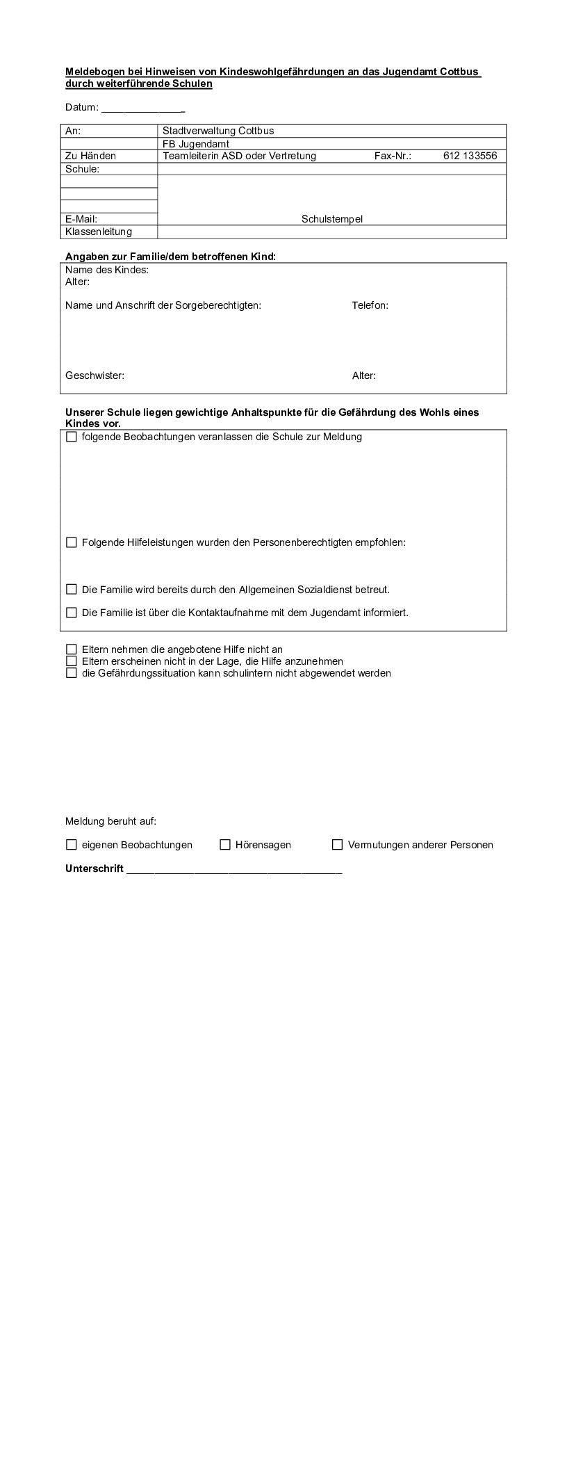 Mit dieser Vereinbarung wurde eine verbindliche, transparente Struktur der Zusammenarbeit der weiterführenden Schulen der Stadt Cottbus mit dem Fachbereich Jugend, Schule und Sport (Jugendamt) in Fällen von Kindeswohlgefährdung beschrieben.