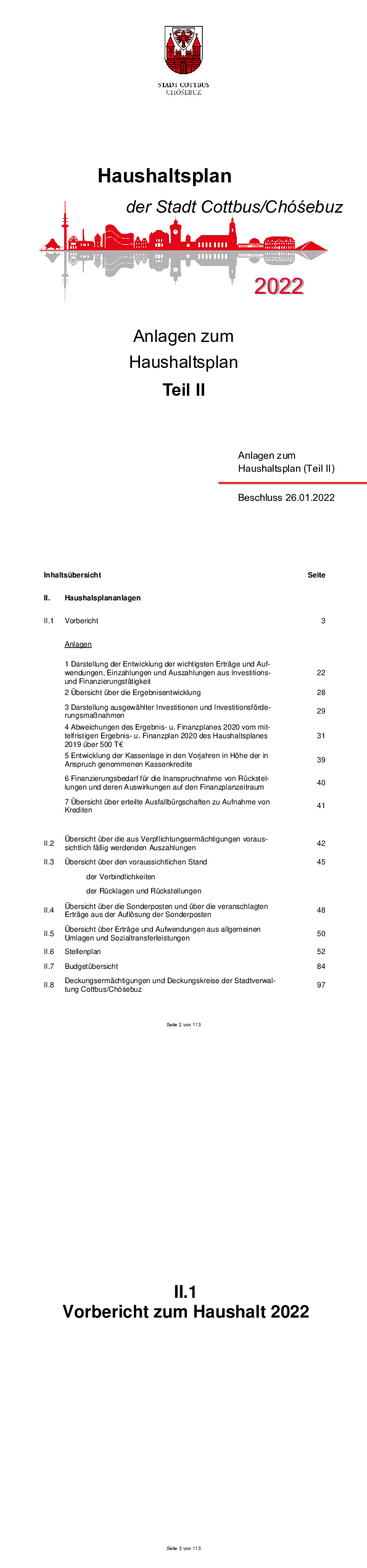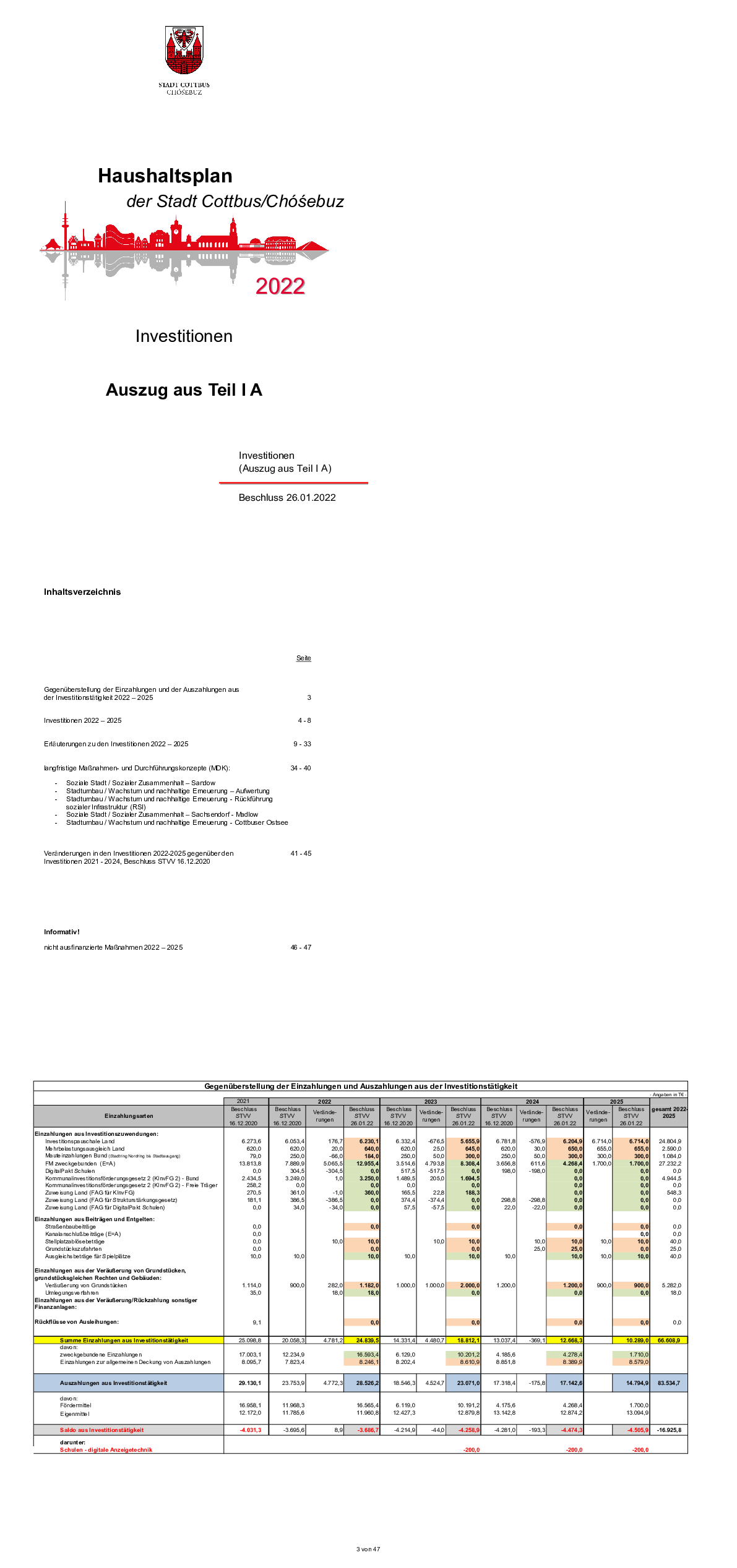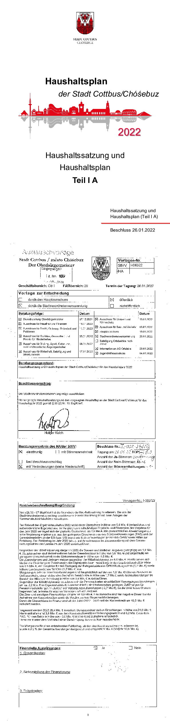Hashaltsplan und Haushaltssatzung der Stadt Cottbus Chóśebuz für das Jahr 2022, Teil IA