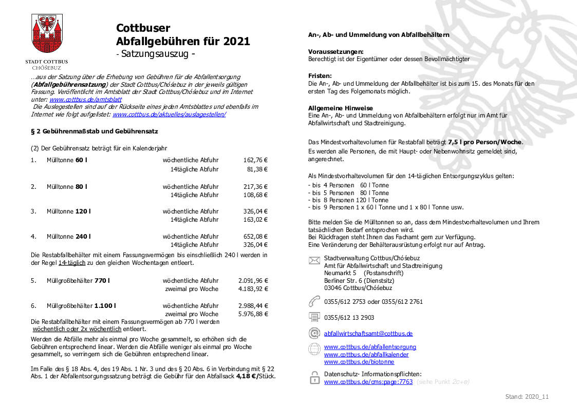 Erstellen von Gebührenbescheiden für die Benutzung der Restabfallentsorgungsanlagen: 0355 612-2794. Nähere Informationen dazu finden Sie unter der Rubrik: Restabfallentsorgungsanlagen, Punkt 2 UMLADESTATION oderauf Seite 18 im Cottbuser Abfallkalender.