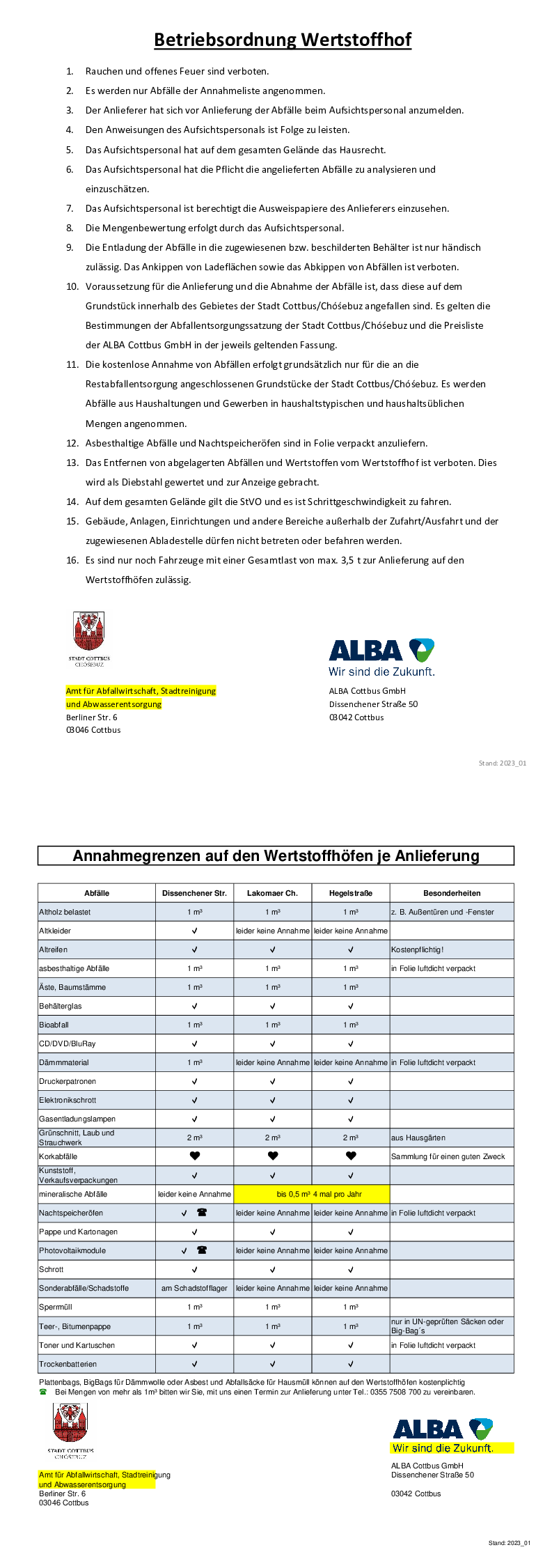 Die Annahme wird nach den volumenabhängigen Anlieferbeschränkungen von geschultem Fachpersonal vorgenommen. Die ALBA Cottbus GmbH ist verantwortlich für die Betreibung der Wertstoffhöfe und die Entsorgung der überlassenen Abfälle. Die Benutzerordnung der WSH regelt die Annahme der verschiedensten Abfallarten. Bitte beachten Sie dazu die Aushänge. Zusätzlich haben die Mitarbeiter das Hausrecht und sind angehalten, die Herkunft des Abfalls durch eine Ausweiskontrolle zu überprüfen und bei gefährlichem Abfall diesen zu protokollieren. Die Entladung muss vom Abfallerzeuger selbst mit eigenem Gerät erfolgen und ist nur händisch in die bereitgestellten Container zulässig. Die Anlieferung mit eigenen Containerfahrzeugen ist nicht zulässig. Die Mitarbeiter der ALBA Cottbus GmbH fungieren als Einweiser und Sichtkontrolleure der Anlieferung. Auf den WSH gilt die Straßenverkehrsordnung mit dem Grundsatz der gegenseitigen Rücksichtnahme. In Stoßzeiten kann es kurzzeitig zum Rückstau kommen. Um Verständnis wird gebeten Bei Asbestplatten muss die Anlieferung in Folie verpackt erfolgen. Diese kann in Baumärkten erworben werden. Ohne Verpackung ist das Umladen in die Container auf den WSH nicht möglich. Die Staubentwicklung ist gesundheits-gefährdend! Anlieferer, die die Bedingungen nicht einhalten, werden zur kostenpflichtigen Entsorgung an die Umladestation verwiesen. Abfallerzeuger mit Abfällen aus dem Nachbarlandkreis werden abgewiesen.