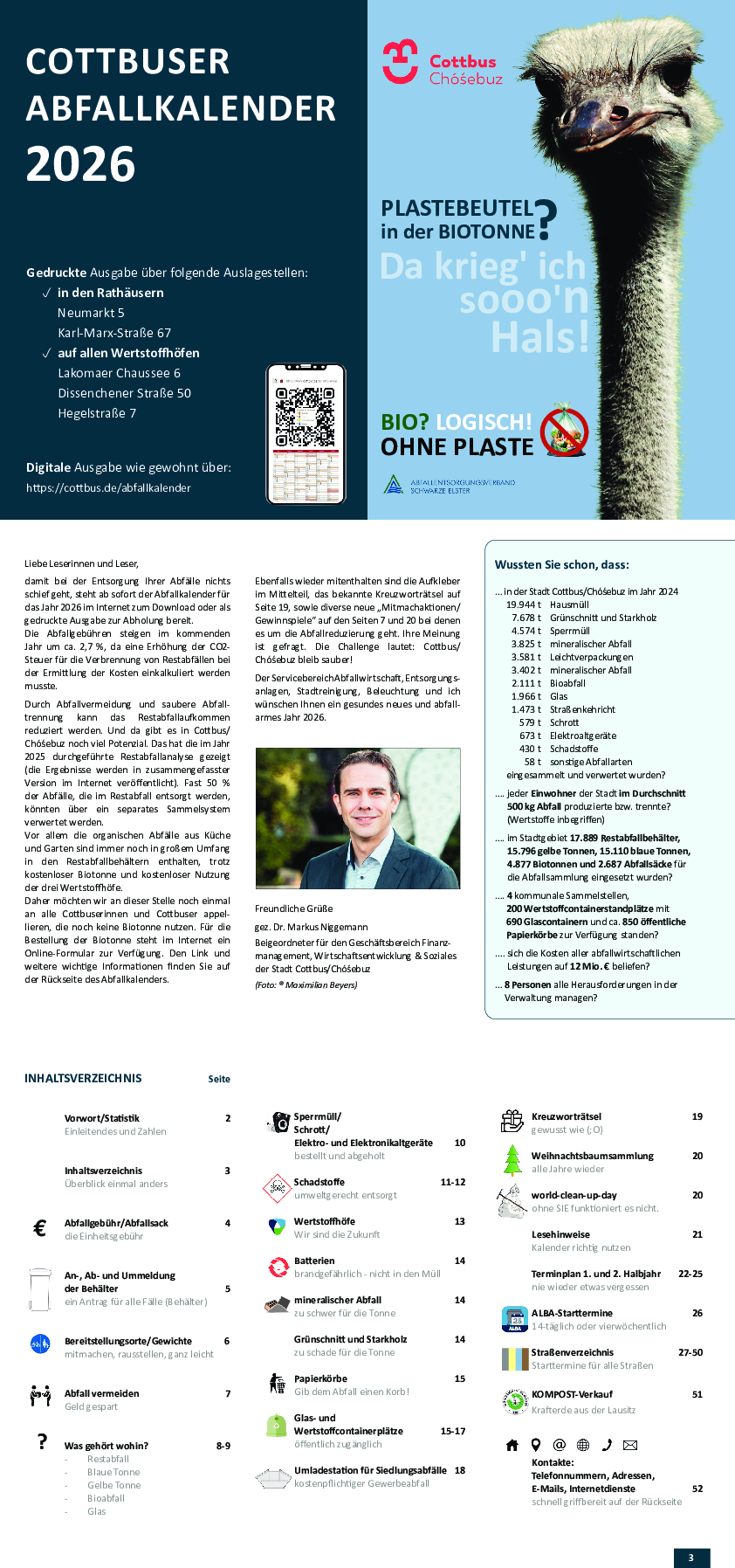 Seit 19.12.2025 liegt die Druckbroschüre des Cottbuser Abfallkalenders 2026 wieder als Abholvariante an beiden Rathäusern und allen Wertstoffhöfen aus. Auf eine Briefkastenzustellung wurde zum Wohle der Umwelt zum 4. Mal in Folge verzichtet.