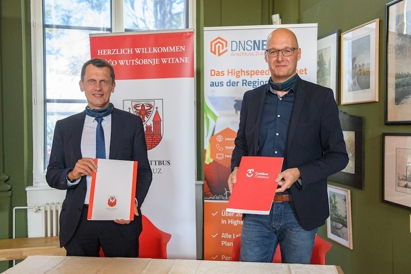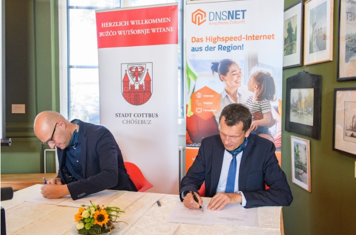 Was von der Stadt Cottbus/Chóśebuz vorausschauend vorbereitet wurde, nimmt nun Gestalt an. Am 22. September 2020 wurde beim feierlichen Spatenstich für „Cottbus als Gigabitstadt“ der Vertrag zwischen der Stadt Cottbus/Chóśebuz und dem ausbauenden Unternehmen und Netzbetreiber, der DNS:NET, unterzeichnet.