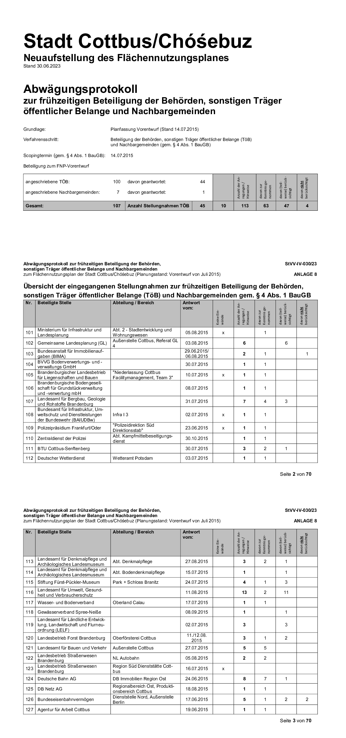 In Cottbus/Chóśebuz ist das förmliche Verfahren zur Neuaufstellung des FNP mit dem Aufstellungsbeschluss (Beschluss-Nr. IV-068-23/10) am 24.11.2010 gemäß § 2 Abs. 1 BauGB eingeleitet worden. Das Erfordernis der Neuaufstellung des FNP war u.a. aus folgenden Gründen gegeben: