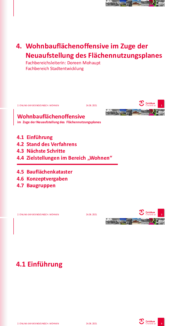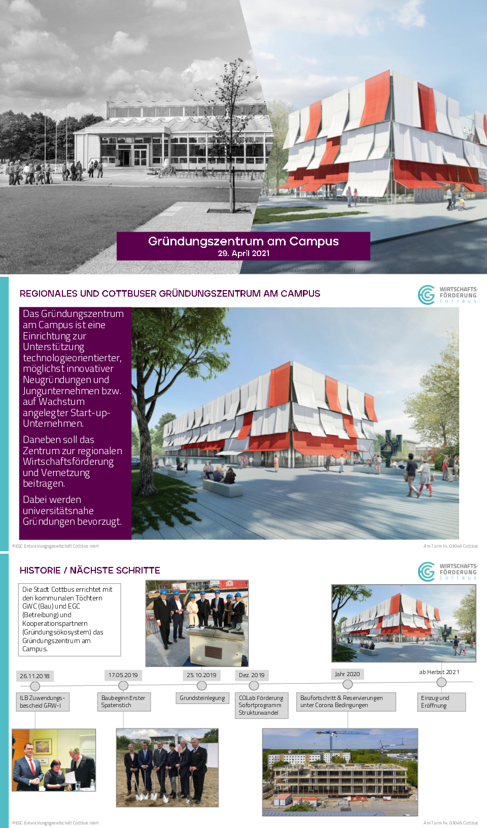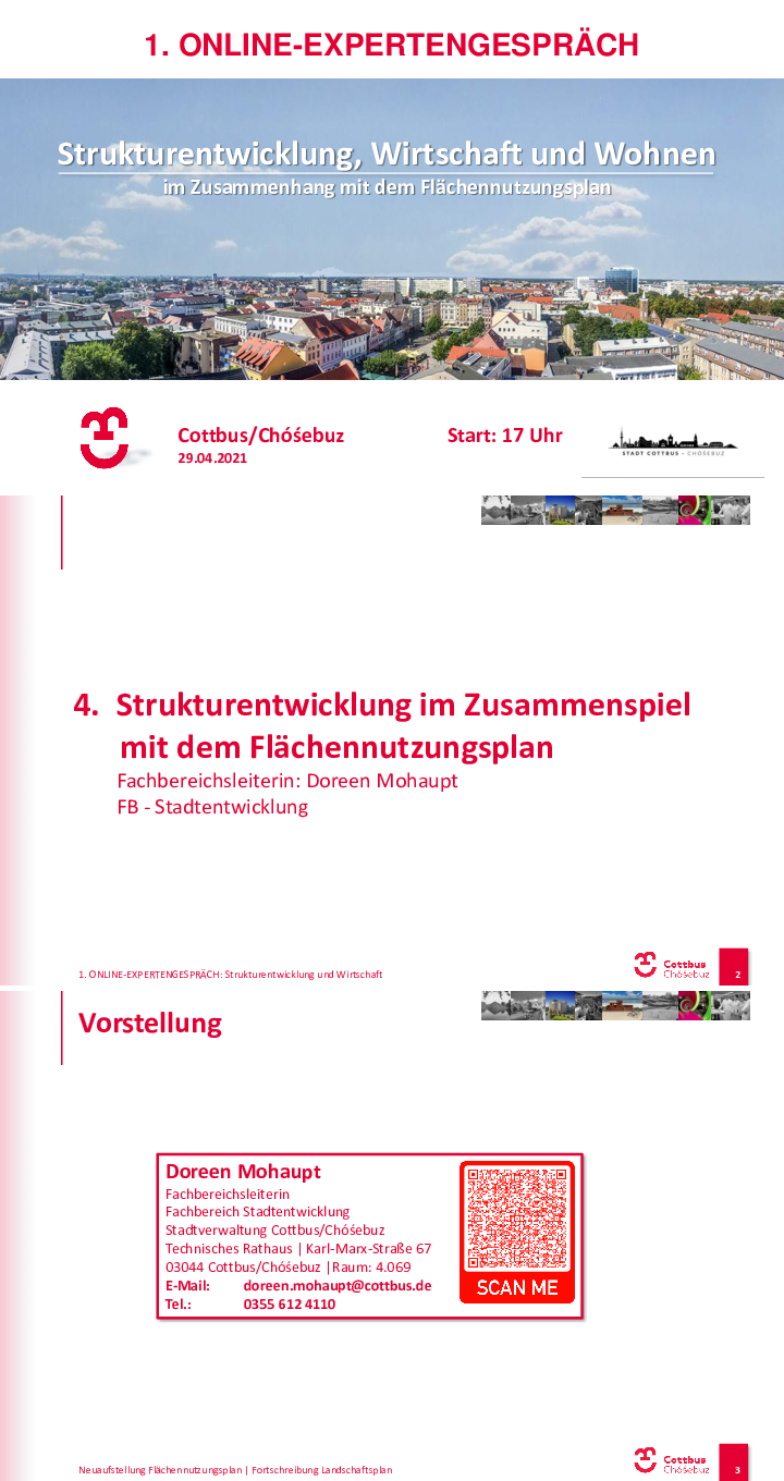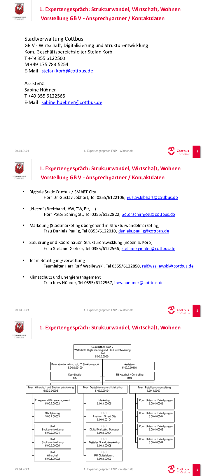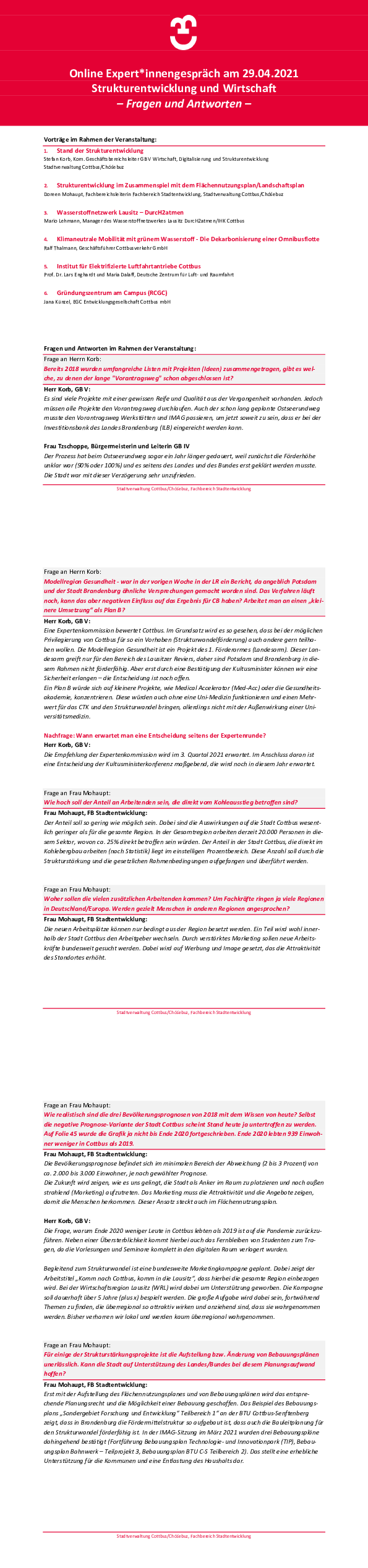 Am 29. April 2021 fand ein öffentliches Online–Expertengespräch in der Reihe „Strukturentwicklung, Wirtschaft und Wohnen im Zusammenhang mit dem Flächennutzungsplan“ statt. Bürgerinnen und Bürgern konnte sich für diese Veranstaltung anmelden, um direkt von verantwortlichen Vertretern der Wirtschaft und der Kommune über die konkreten Auswirkungen des Strukturwandels auf Cottbus/Chóśebuz informiert zu werden.