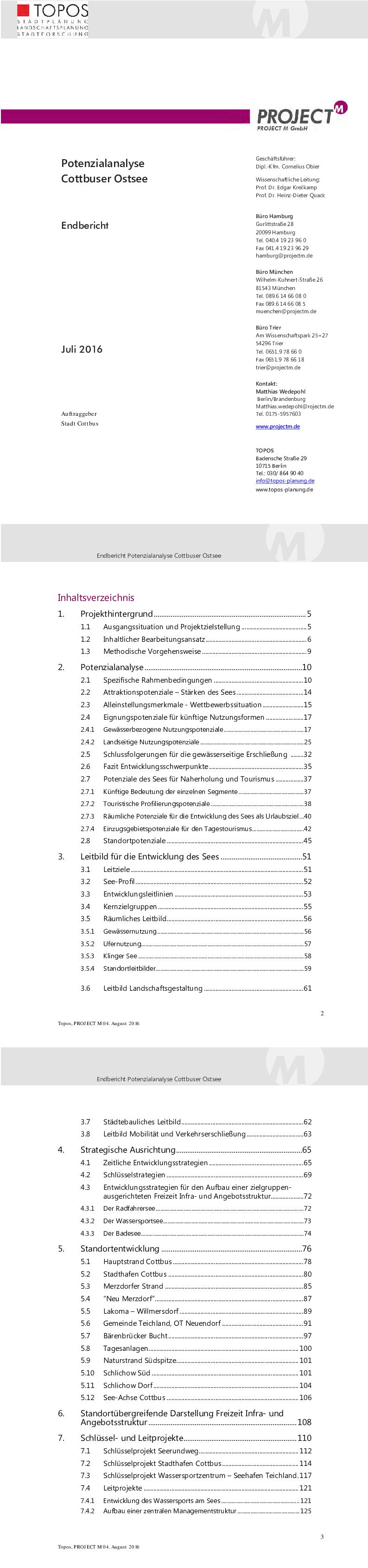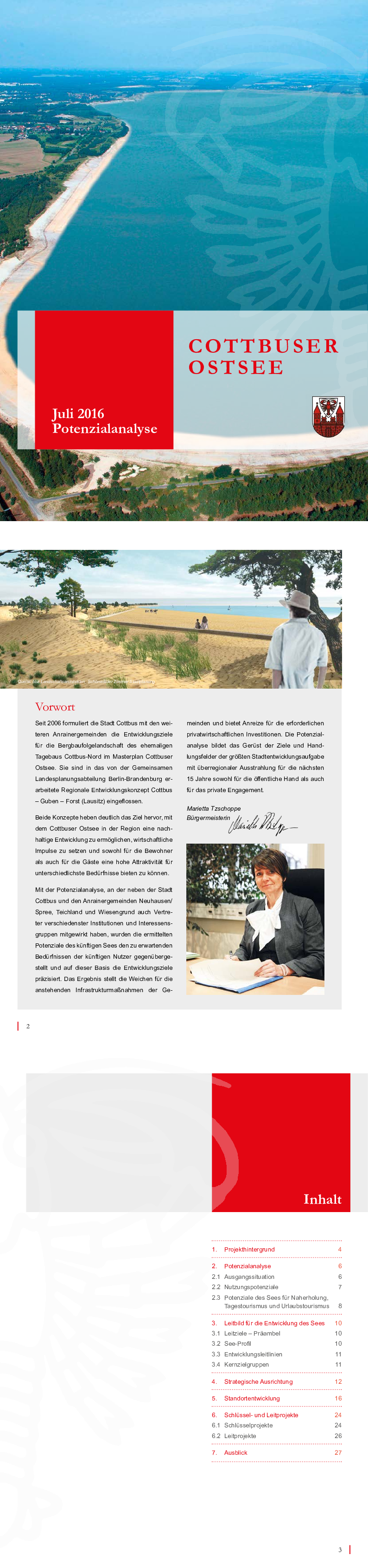 Im September 2016 haben die Stadtverordneten die Potenzialanalyse „Cottbuser Ostsee“ beschlossen. Im Folgenden stellen wir Ihnen die Beschlussvorlage, die Broschüre mit umfangreichen Informationen und ein Faltblatt mit einer Kurzübersicht zur Verfügung.