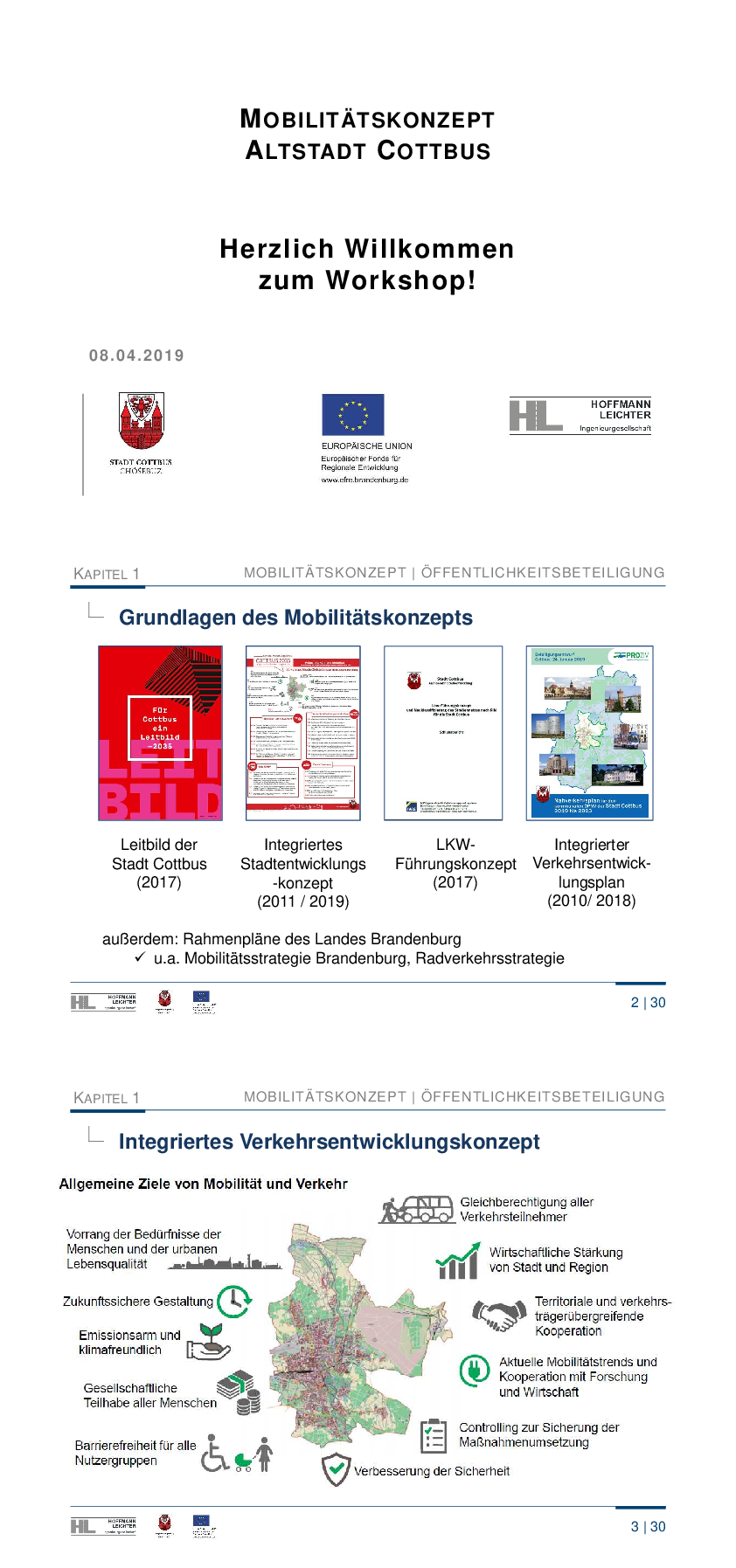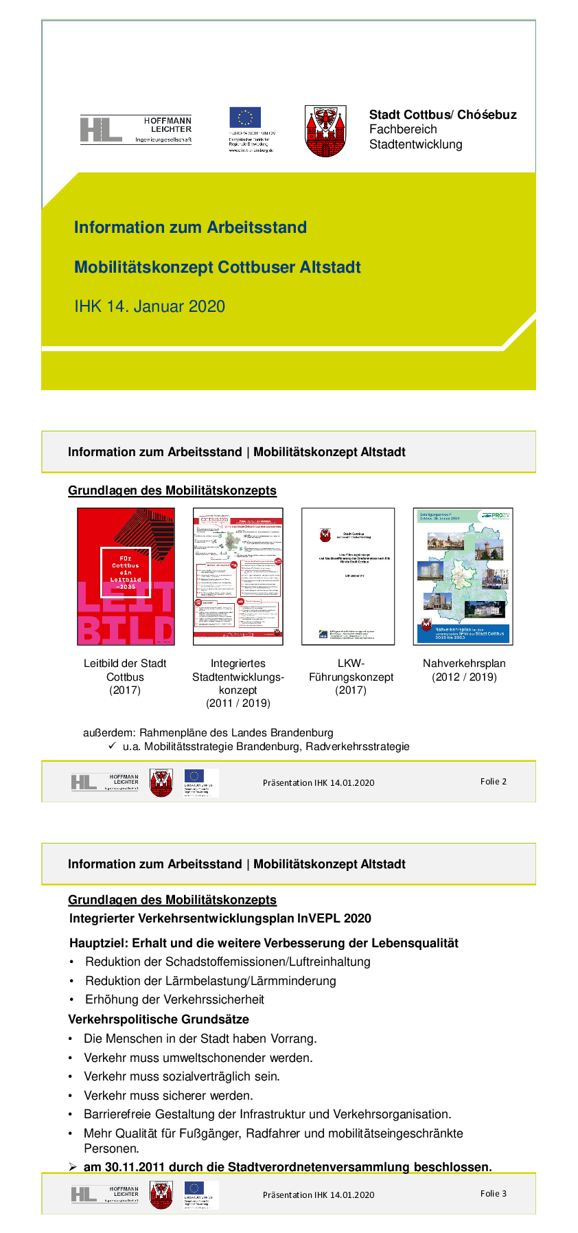 Der aktuelle Stand wurde am 14.01.2020 auf zwei öffentlichen Veranstaltungen durch die Stadtverwaltung Cottbus/Chóśebuz und dem bearbeitenden Büro Hoffmann-Leichter Ingenieurgesellschaft mbH vorgestellt .