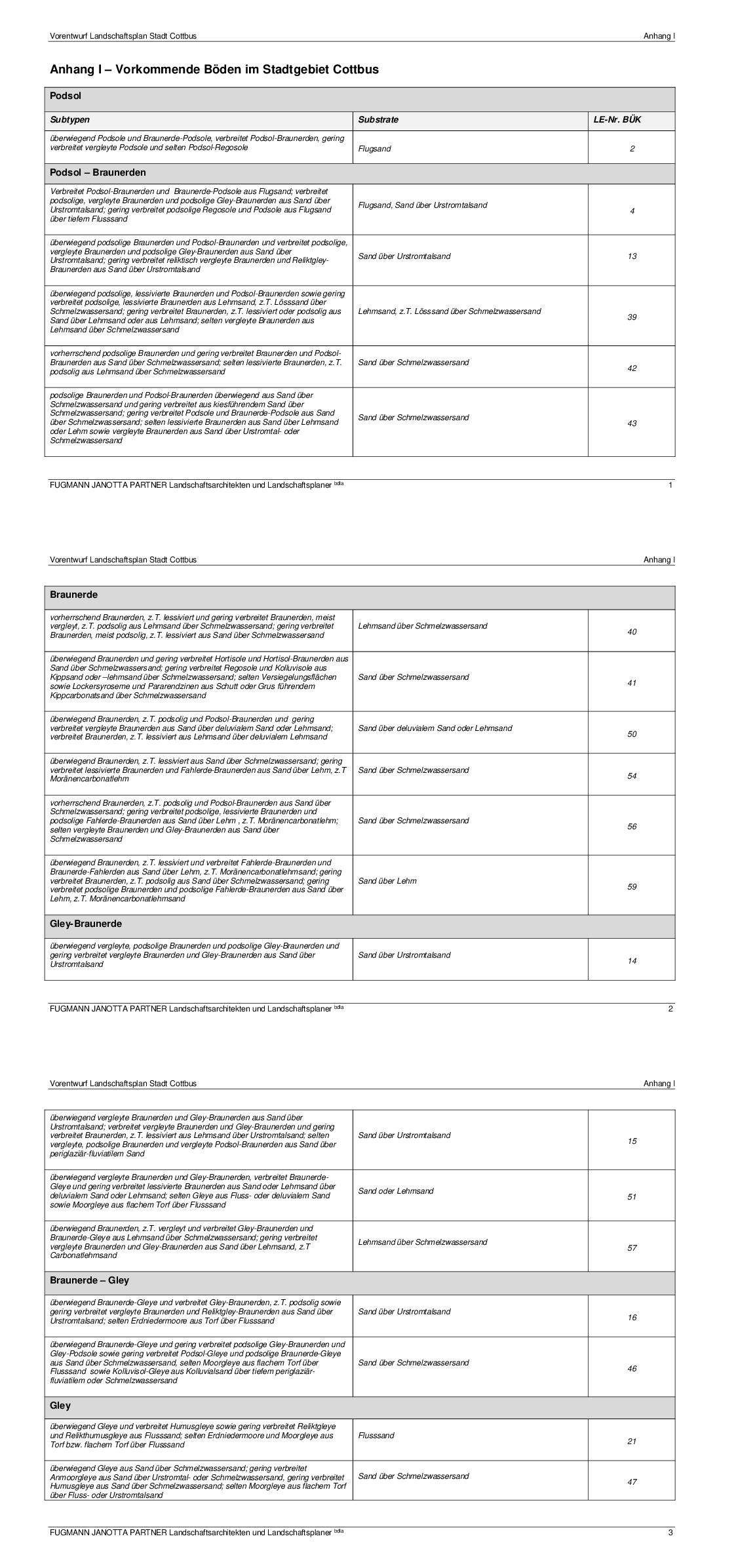 Der wirksame Landschaftsplan der Stadt Cottbus ist aus dem Jahre 1996. Für die Gemeinde Groß Gaglow gibt es einen Vorentwurf zum Landschaftsplan aus dem Jahr 1997 und für die Gemeinde Gallinchen einen Landschaftsplan aus dem Jahr 2000. Die Gemeinde Kiekebusch hatte zum Zeitpunkt der Eingemeindung keinen eigenen Landschaftsplan vorliegen.