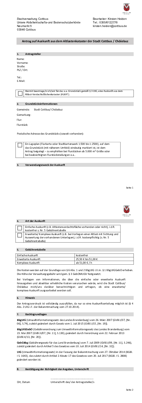 Antrag auf Auskunft aus dem Altlastenkataster der Stadt Cottbus Chóśebuz
