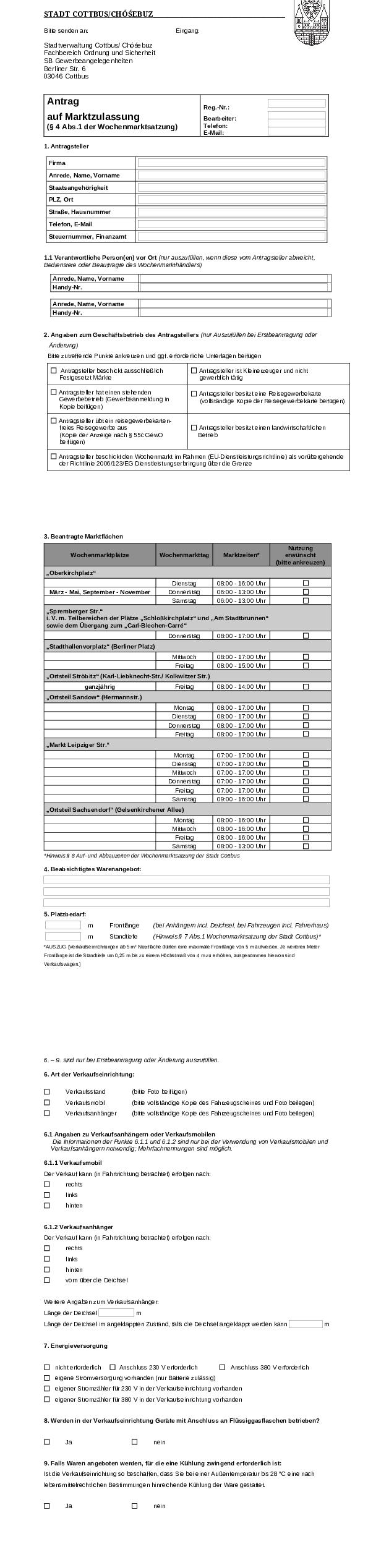 | Sondernutzungen, Wochenmärkte | Frau Schulz (231) ute.schulz@cottbus.de | 0355 612-2828 0151 125-85913 |