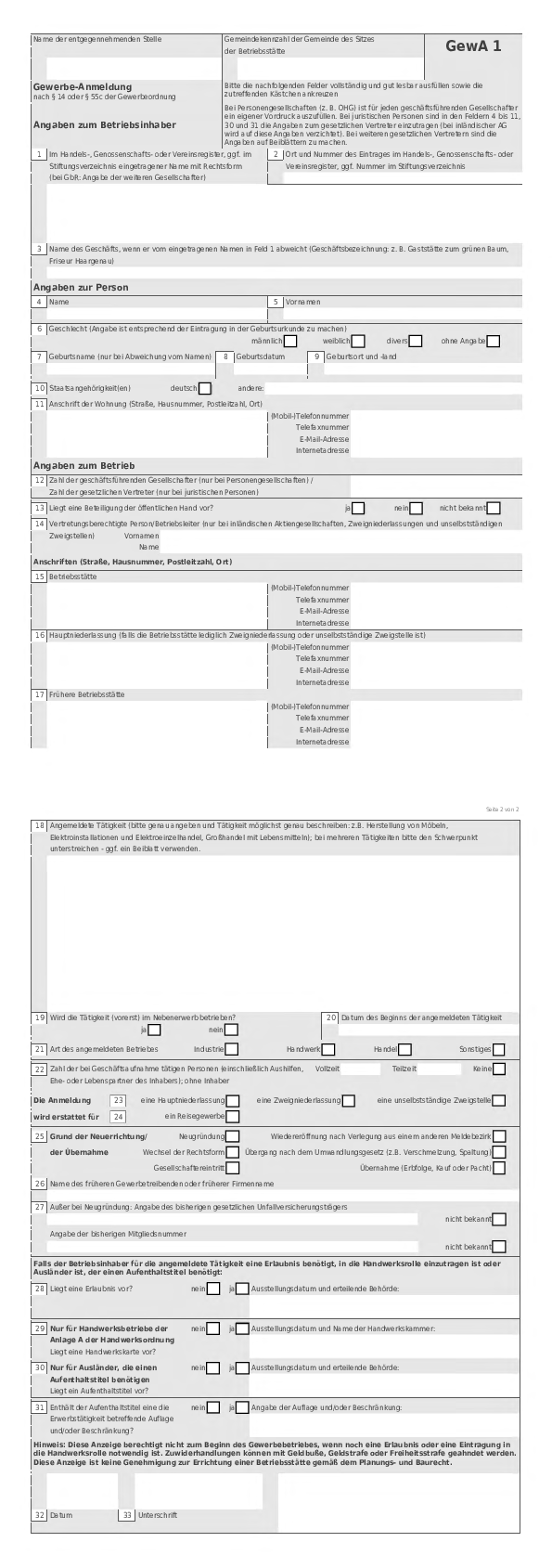 Für Anzeigen nach dem BbgGastG können Sie die beigefügten Formulare GewA1 für die Gewerbeanmeldung, GewA2 für die Gewerbeummeldung und GewA3 für die Gewerbeabmeldung nutzen. Für die Anzeige eines vorübergehenden Gaststättengewerbes nutzen Sie bitte das Gagev Formular.
