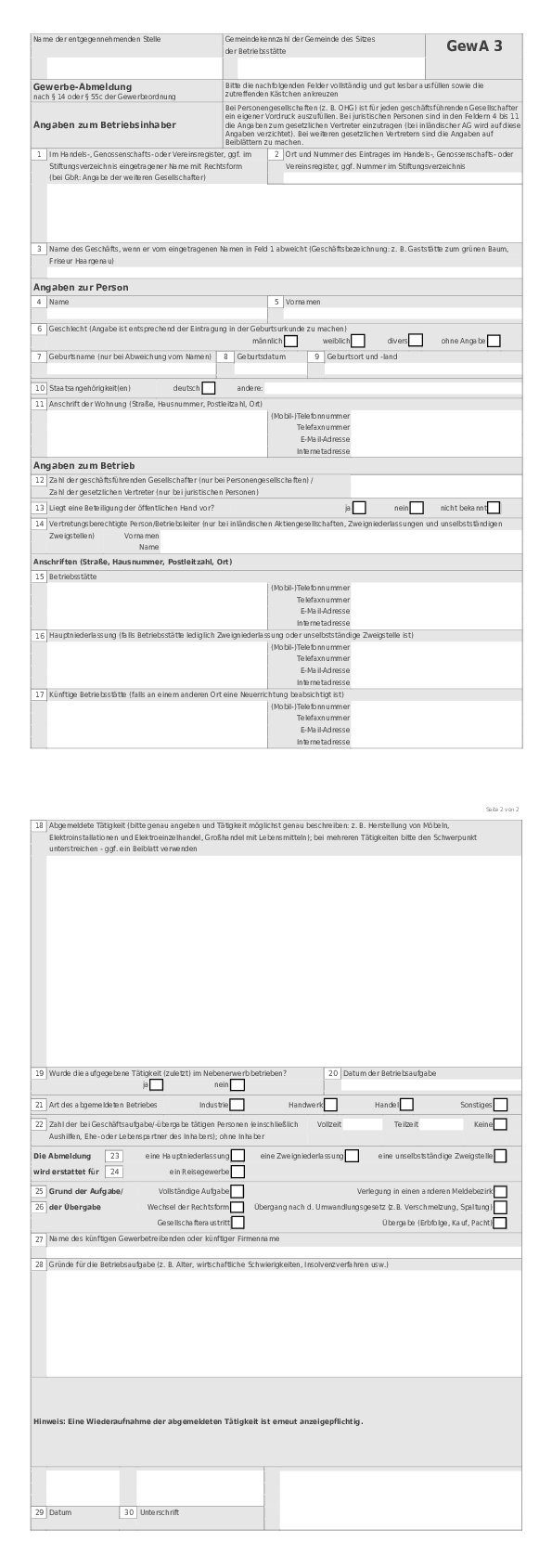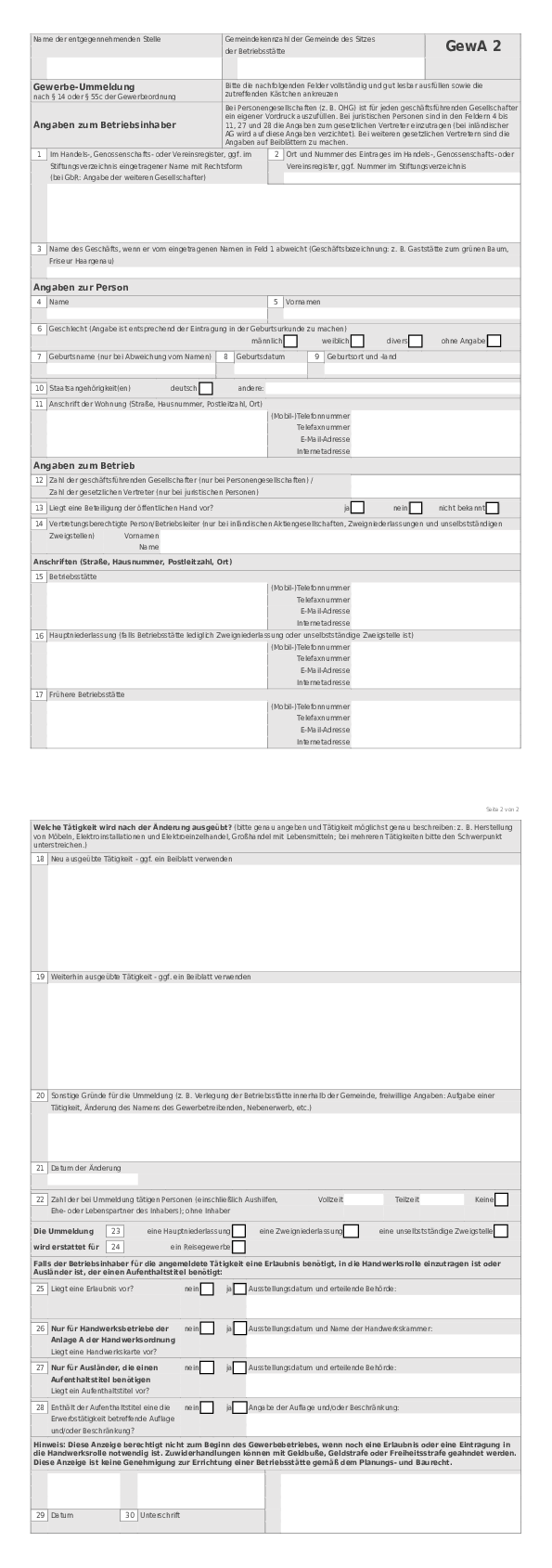 Falls Sie keine Gelegenheit haben, die Behörde persönlich aufzusuchen, nutzen Sie einfach unseren Formularservice oder die auf dieser Seite zur Verfügung gestellten Formulare zur Gewerbeanmeldung (GewA1), Gewerbeummeldung (GewA2) und Gewerbeabmeldung (GewA3).
