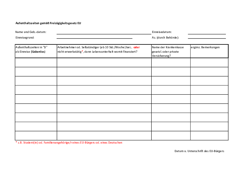 Aufenthaltszeiten gemäß Freizügigkeitsgesetz EU