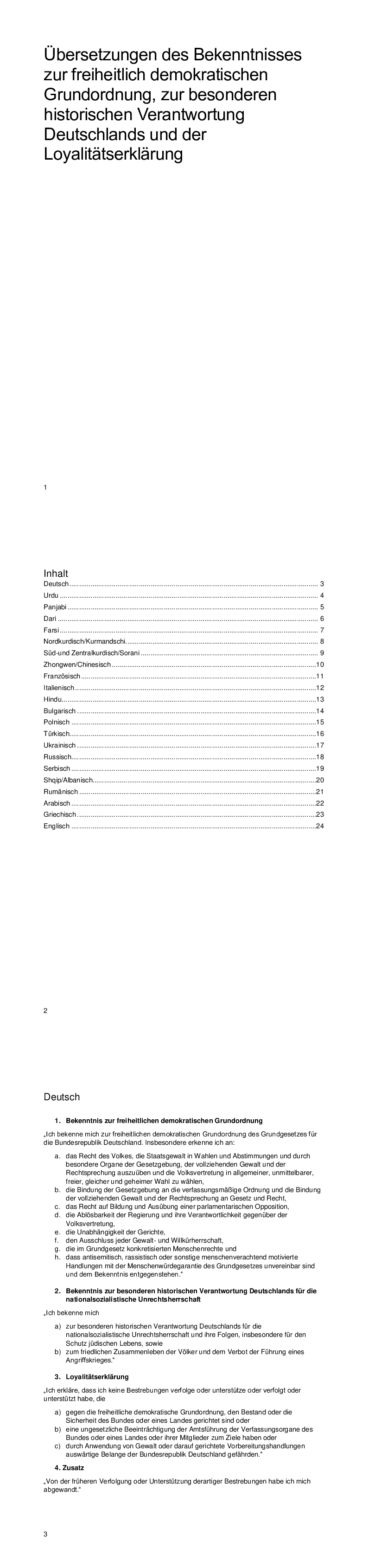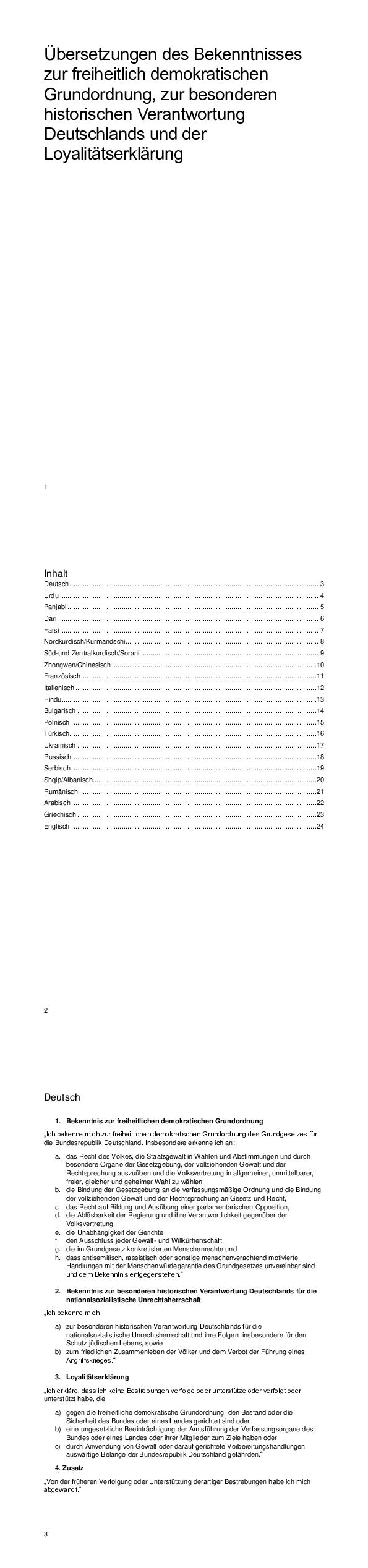 Übersetzungen des Bekenntnisses zum Grundgesetz und der Loyalitätserklärung