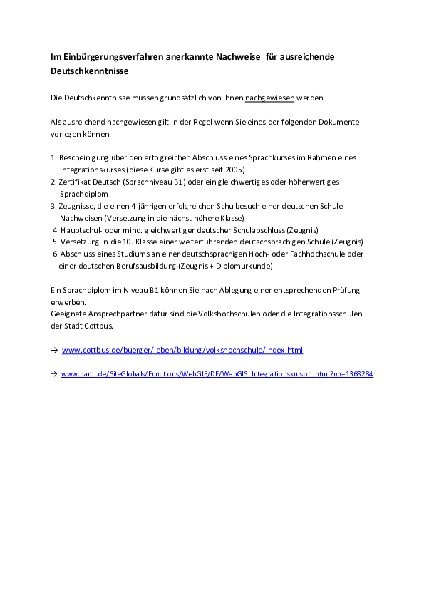 Ein Sprachzertifikat erhalten Sie bei jedem anerkannten Sprachprüfungszentrum. Bei Fragen hierzu wenden Sie sich bitte an Ihre Staatsangehörigkeitsbehörde in Cottbus/ Chóśebuz.