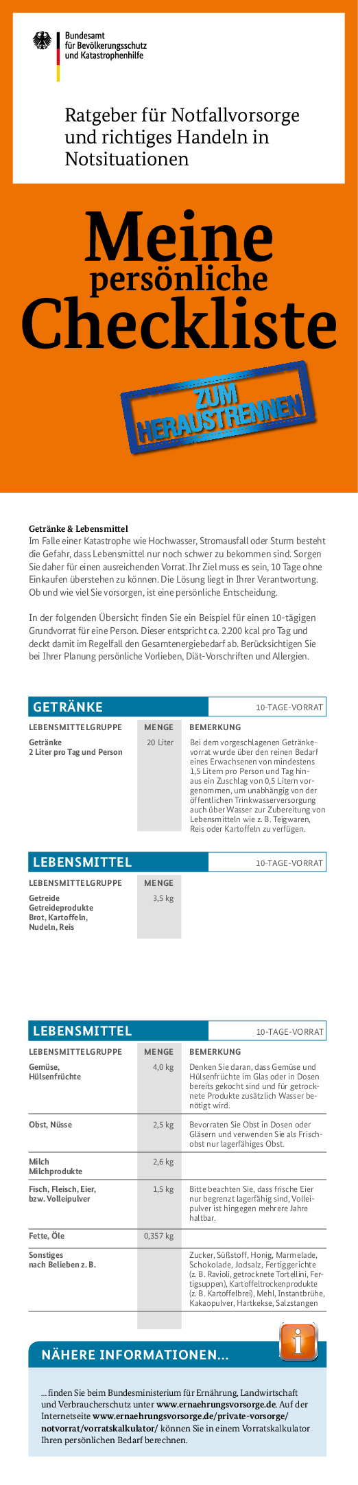 Das staatliche Hilfeleistungssystem greift in solchen Situationen und bietet Unterstützung. Aber auch die beste Hilfe ist nicht immer sofort zur Stelle. Bei großflächigen Schadenslagen können die Rettungskräfte nicht überall gleichzeitig sein. Wer vorbereitet ist, kann sich selbst, Angehörigen und Nachbarn helfen, bis die staatliche Hilfe eintrifft und Schäden mit Schutzmaßnahmen reduzieren. Helfen Sie mit, Notsituationen gemeinschaftlich zu bewältigen, und sorgen Sie vor! Hier finden Sie Anregungen und Empfehlungen für die Planung Ihrer persönlichen Notfallvorsorge.