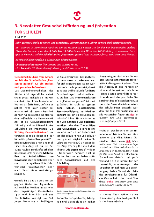 die Schulzeit ist eine prägende Lebensphase für alle jungen Heranwachsenden. In dieser Zeit entwickeln die Jugendlichen ihre eigene Identität und treffen zunehmend eigenständige Entscheidungen, die ihr weiteres Leben mitbestimmen. Auch das dann erworbene Gesundheitsverhalten wirkt sich darauf aus. In Anbetracht von ständig neuen Internet-Trends oder dem zunehmenden Einfluss von Influencern möchten wir Sie in Ihrer Arbeit in den Schulen besonders hinsichtlich der Vermittlung von gesundheitsfördernden Themen und der Prävention unterstützen. Darum veröffentlichen wir in regelmäßigen Abständen einen Newsletter für schulrelevante Themen. In diesem finden Sie praktische Tipps, aktuelle Angebote und Hinweise auf weiterführende Informationen oder Begleitmaterial, die den Schulalltag bereichern können. Auf dieser Seite veröffentlichen wir sowohl den aktuellen als auch die vergangenen Newsletter zum Herunterladen. Schauen Sie gerne regelmäßig vorbei.