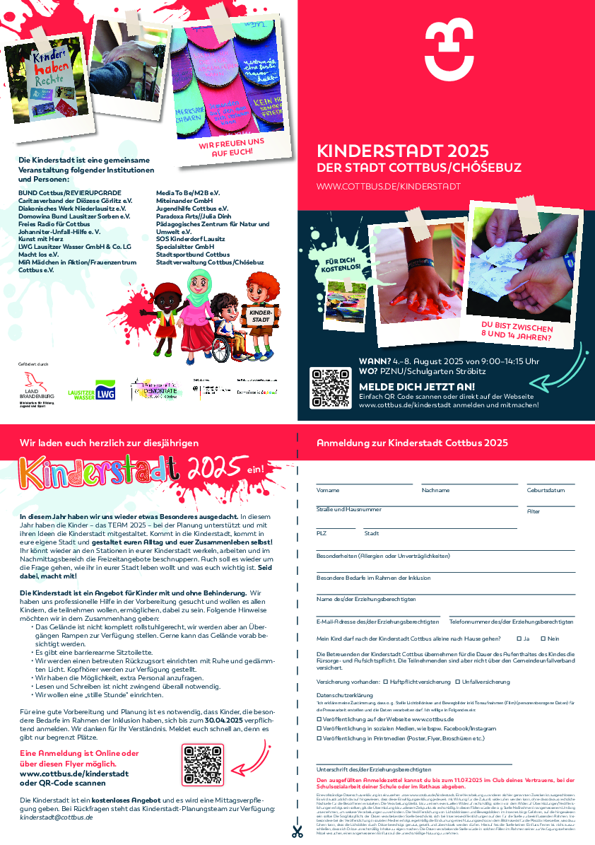 Die Kinderstadt 2025 fand vom 4. bis 8. August 2025 im Pädagogischen Zentrum für Natur und Umwelt (PZNU), Dahlitzer Str. 12, 03044 Cottbus statt.
