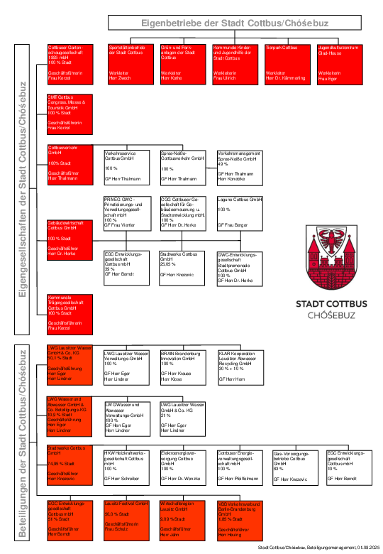 Die Stadt Cottbus/Chóśebuz hat eine Vielzahl ihrer Aufgaben ausgegliedert und in Unternehmen in privater Rechtsform und in Eigenbetrieben organisiert. Diese städtischen Unternehmen unterliegen dem Einfluss der Gesellschafterin Stadt Cottbus/Chóśebuz und ihrer strategischen und fachlichen Vorgaben. Ziel der Stadt Cottbus/Chóśebuz ist, dass die an eigenständige Organisationsformen übertragenen Aufgaben qualitativ und quantitativ, sicher und rechtlich einwandfrei erfüllt werden.