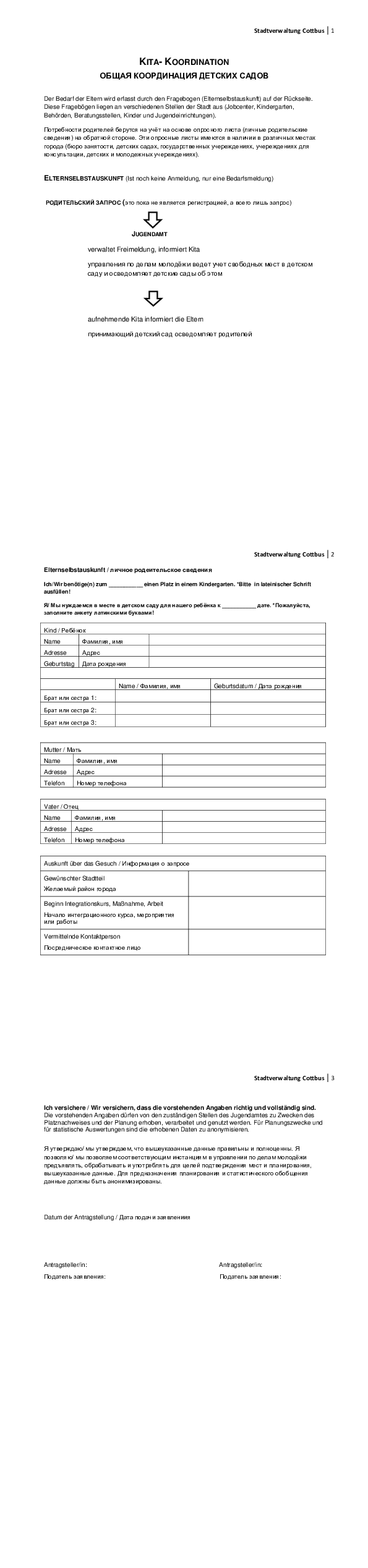 Ziel der Stadt Cottbus ist es, Flüchtlingskinder und -jugendliche nach Ankunft in unserer Stadt schnellstmöglich zu integrieren, hierzu zählt auch der Besuch einer Kindertagesstätte. Die hier in verschiedenen Sprachen zum Download zur Verfügung stehenden Formulare sind ein Hilfsmittel, um die Anmeldeformalitäten trotz Sprachbarrieren rechtssicher und auch für die Geflüchteten verständlich vorzunehmen.