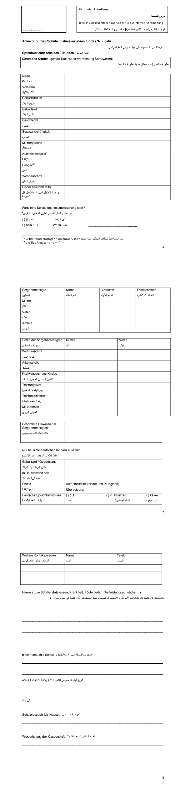 Der Bedarf der Eltern/Schüler wird durch den hier zur Verfügung gestellten Fragebogen (Elternselbstauskunft) erfasst und die Schulaufnahme für Geflüchtete beantragt.