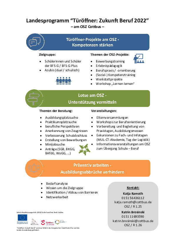 „Türöffner: Zukunft Beruf“ ist ein Landesprogramm des Ministeriums für Bildung, Jugend und Sport und wird aus Mitteln des Europäischen Sozialfonds Plus und des Landes Brandenburg gefördert. Ziel des Landesprogrammes ist es, die berufliche Integration von Jugendlichen am Übergang Schule – Beruf durch auf den Lernort Oberstufenzentrum (OSZ) bezogene Maßnahmen zu unterstützen.