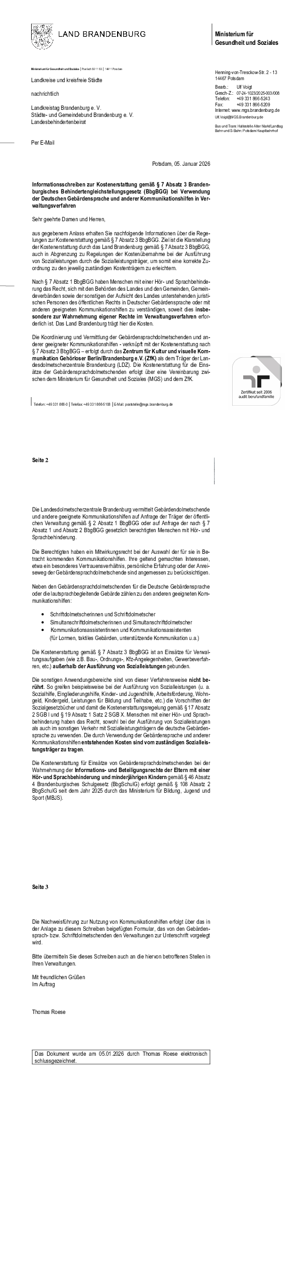 Rundschreiben an Kommunen zur Kostenerstattung gem. § 7 Abs. 3 BbgBGG