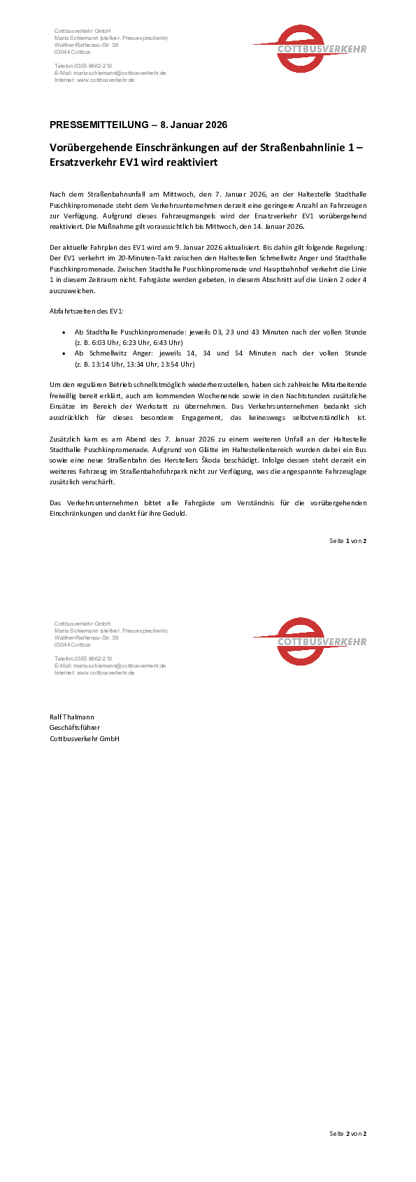 Vorübergehende Einschränkungen auf der Straßenbahnlinie 1